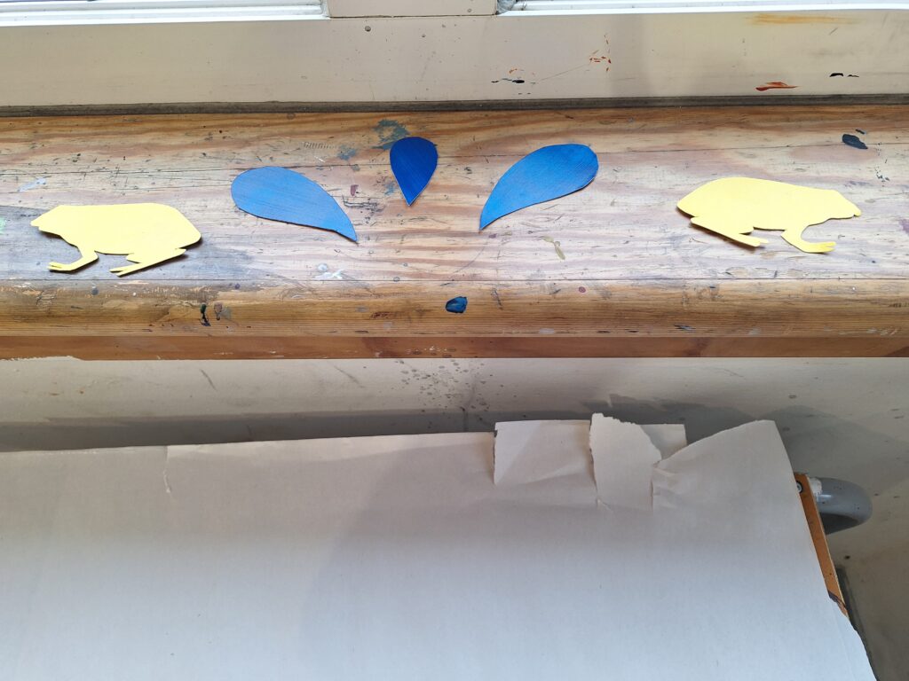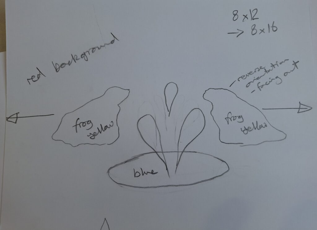 I spent time thinking about my composition while out for a walk and came up with a rough plan of two yellow frogs and a blue puddle with splashes.
