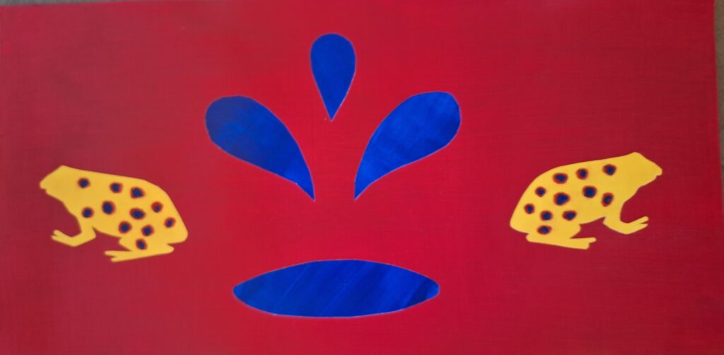 I was happy with the finished collage. It feels playful and and the subject matter suits the colour choices. One aspect I could change would be to vary the spots on each frog so they are similar rather than identical. I hadn’t fully grasped the possibility of doing this while I developed my composition.