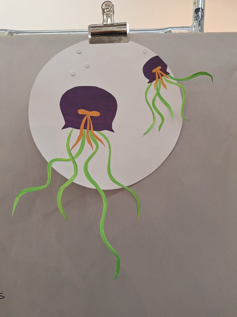 Jelly fish- one near, one far. In my mind, I imagined the long tentacles hanging off the bottom of the collage were stabilizing the image. However, I was advised that this isn’t the case. Also, I was advised there was too much white painted space on the image.