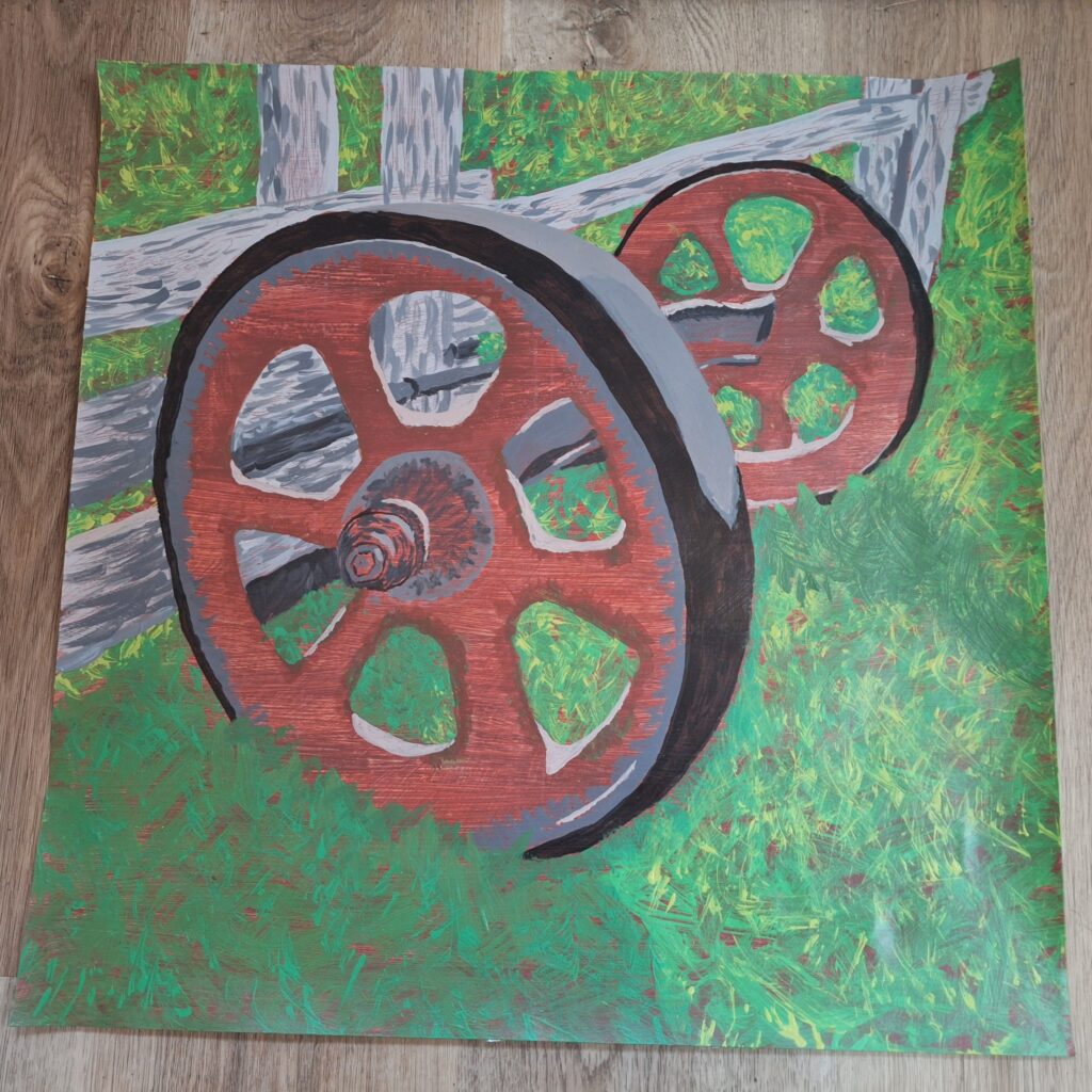 I learned a lot along the way- about recognizing if a colour needed more red or green. About how to created dark and light areas. And also the perspective of looking sideways at the wheel and seeing an oval rather than a circle.